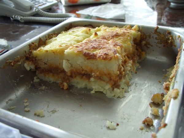 然後炒蕃茄肉醬,再放到烤盤上,一層馬鈴薯泥、一層蕃茄肉醬、再一層馬鈴薯泥。